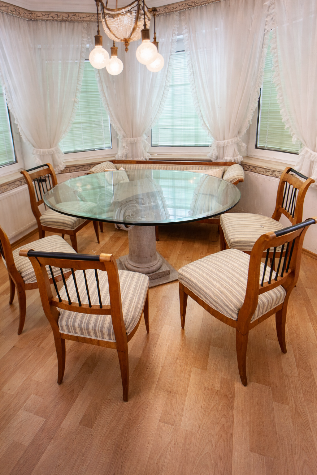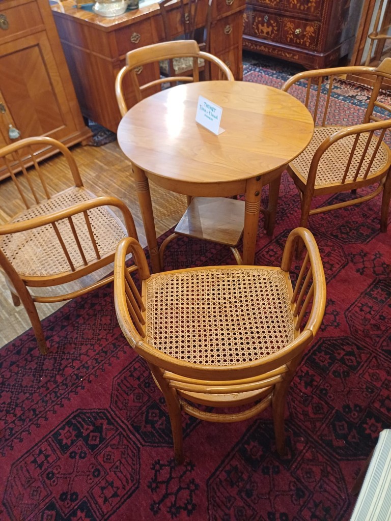 Tonet Sitzgarnitur bestehend aus 1 Tisch und 4 Amstühlen, Sitze mit Geflecht, Sitzhöhe 42 cm Stuhlhöhe 73 cm signiert