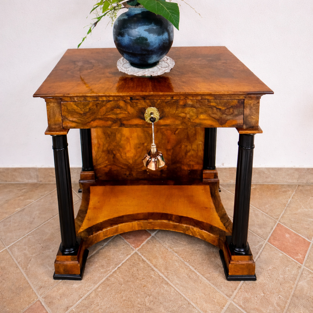 Nuss furniert, schwarze Säulen, Bodenplatte Ahorn, B 82cm, H 83cm , T47cm, um 1820